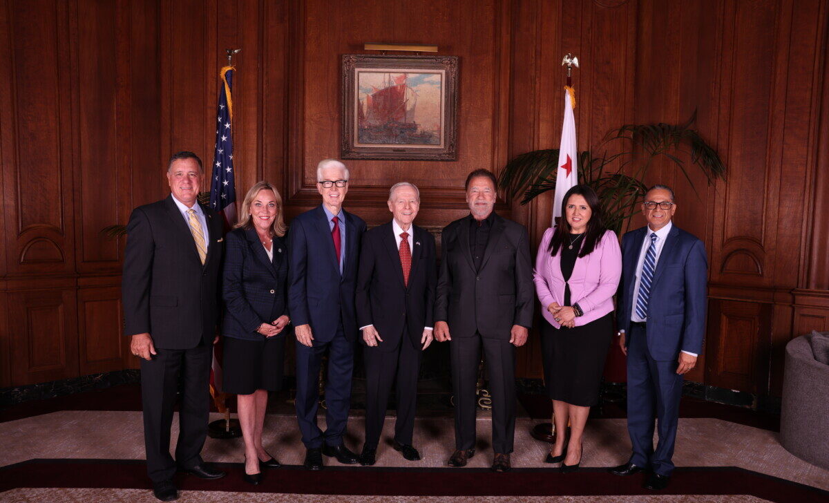 (From left to right) Supervisor Donald Wagner (Orange County), Supervisor Kathryn Barger (Los Angeles), Governor Gray Davis, Governor Pete Wilson, Governor Arnold Schwarzenegger, Supervisor Nora Vargas (San Diego), and Supervisor V. Manuel Perez (Riverside)
