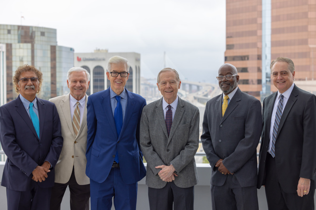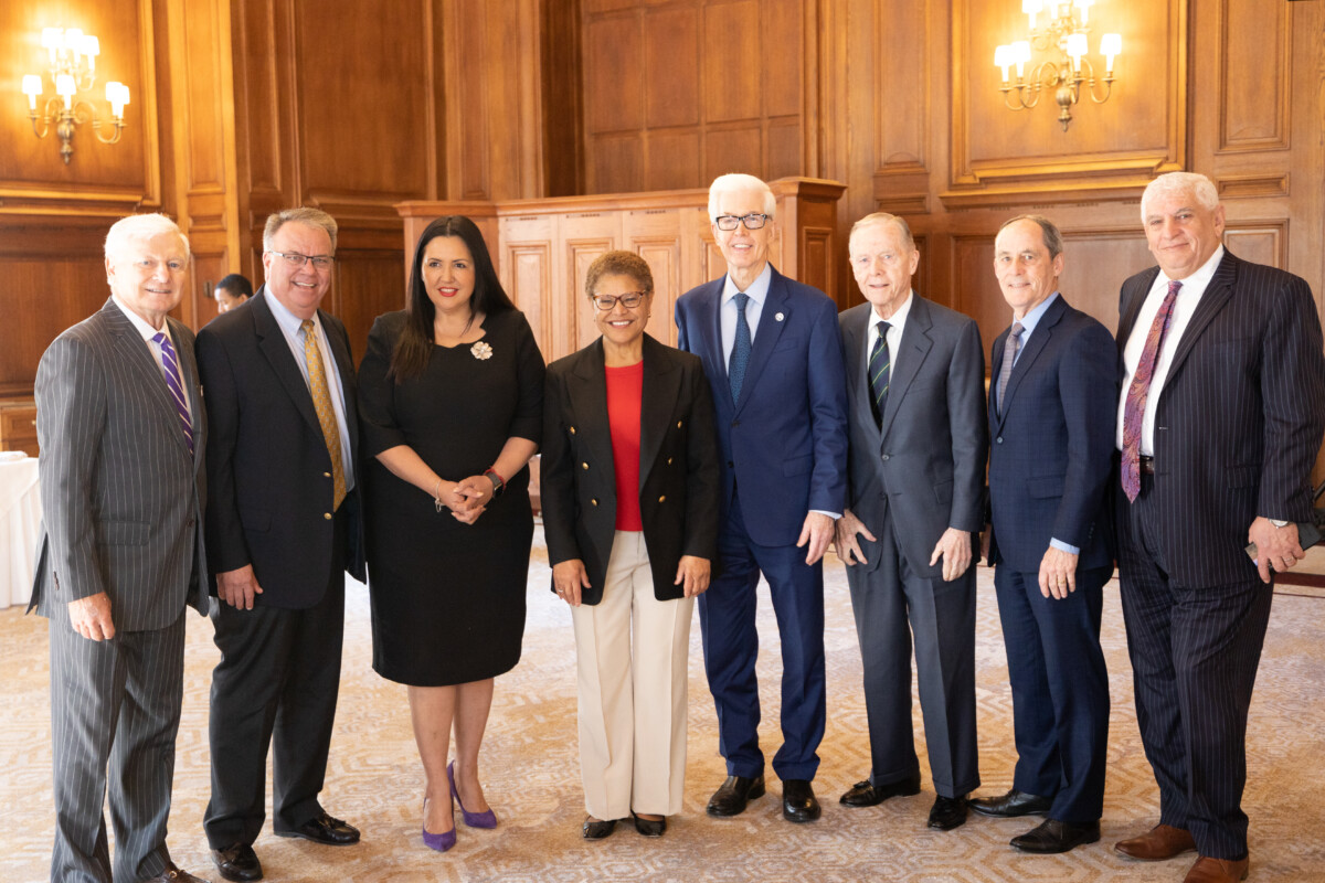 (From left to right) SCLC President Mike Roos, Board Member Greg Bielli, Supervisor Nora Vargas, Los Angeles Mayor Karen Bass, Governor Gray Davis, Governor Pete Wilson, Board Member Tom Priselac and Board Member Hasan Ikhrata.